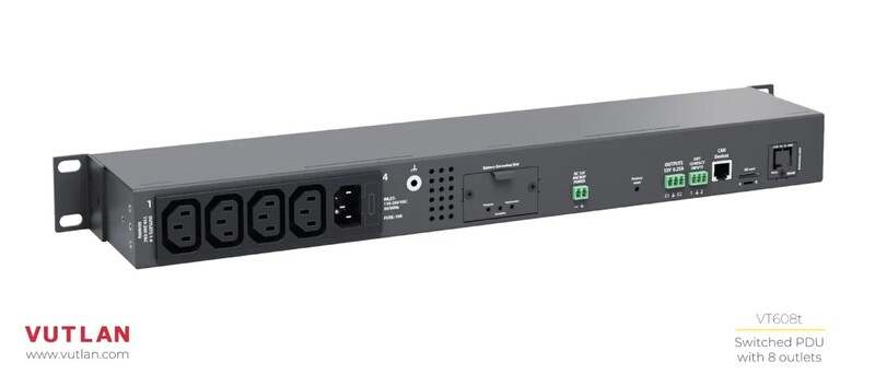 VT604t / Přepínaná PDU se 4 zásuvkami lze použít pro dálkové zapínání, vypínání nebo restartování až čtyř jednotlivých zásuvek a také podporuje komplexní monitorování prostředí.