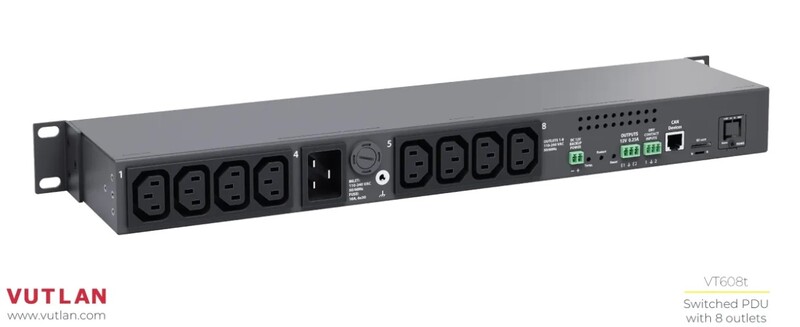 VT608t / Přepínaná PDU s 8 zásuvkami lze použít pro dálkové zapínání, vypínání nebo restartování až čtyř jednotlivých zásuvek a také podporuje komplexní monitorování prostředí.
